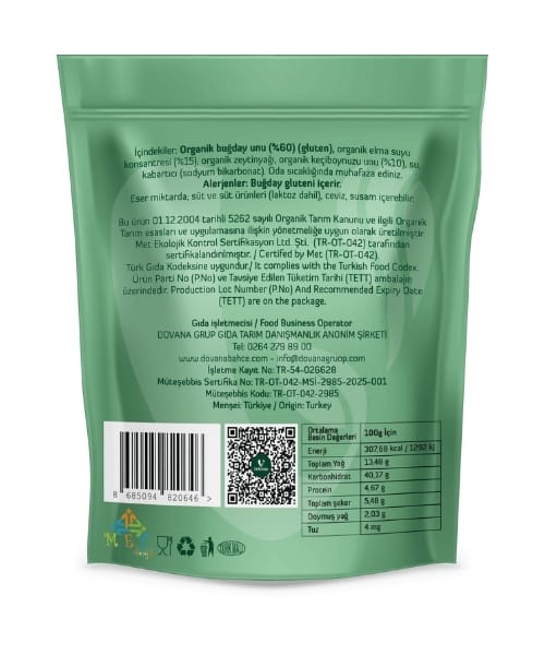 İçindekiler: Organik buğday unu (gluten), organik elma suyu konsantresi (%15), organik zeytinyağı, organik keçiboynuzu unu (%10), su, kabartıcı (sodyum bikarbonat).